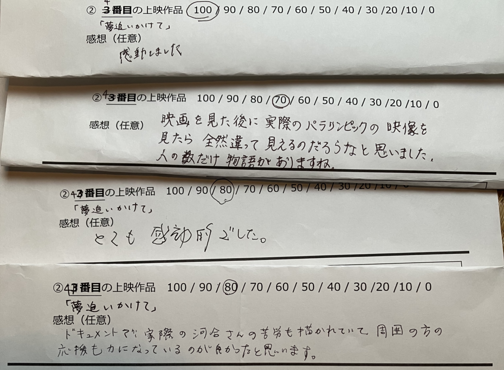 コンペティション部門の審査は、三重県鳥羽市の住民・勤務者・出身者など鳥羽市と接点を持つ方から不作為に選択させていただき、同意頂いた方のご意見を集計、選考基準としています。忖度無しのご意見を、出品された監督・プロデューサーや製作側の皆さんにお届けします。(写真はグランプリの「夢追いかけて」の採点・ご意見)